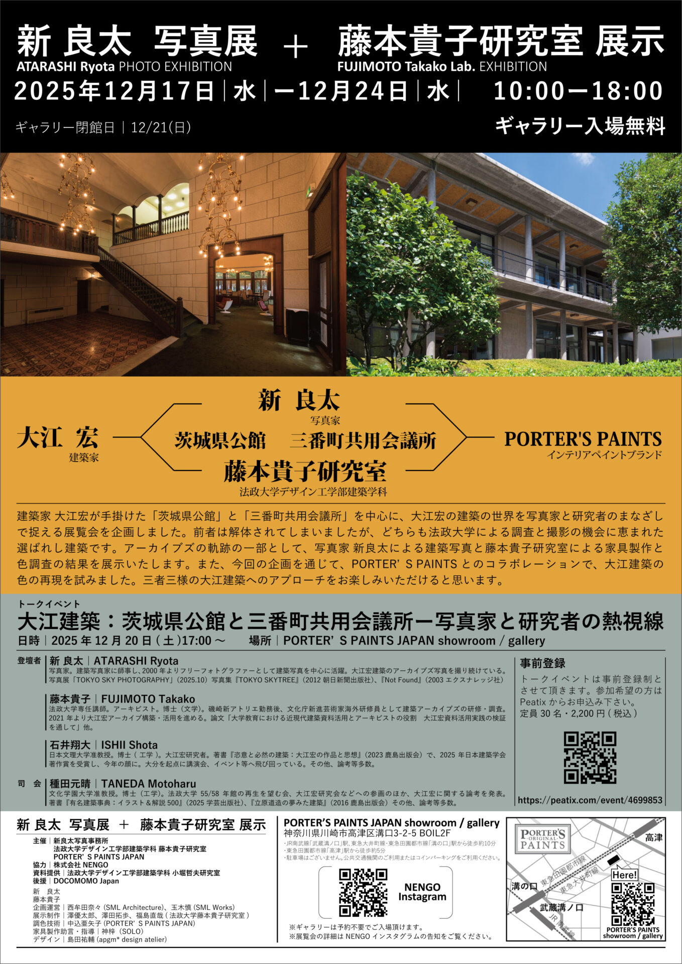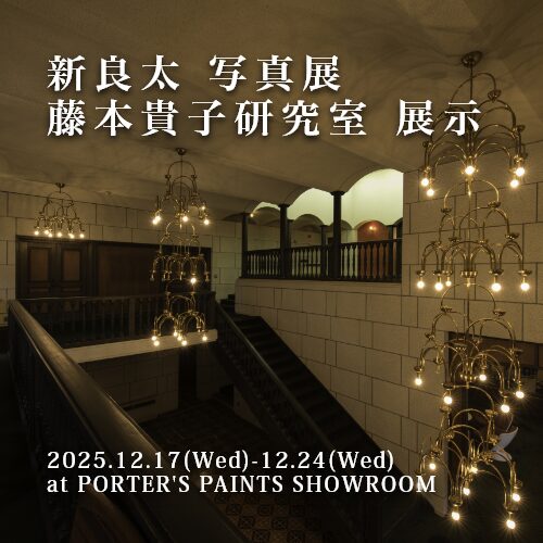 このたび、ポーターズペイントショールームにて建築写真家 新良太さまの写真展、ならびに法政大学デザイン工学部建築学科 藤本貴子研究室の資料展示を開催いただくこととなりました。