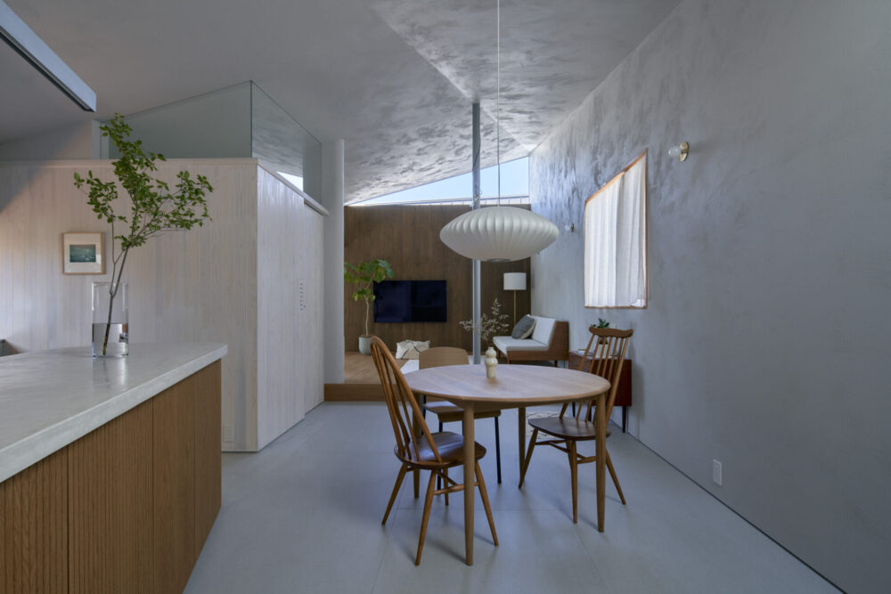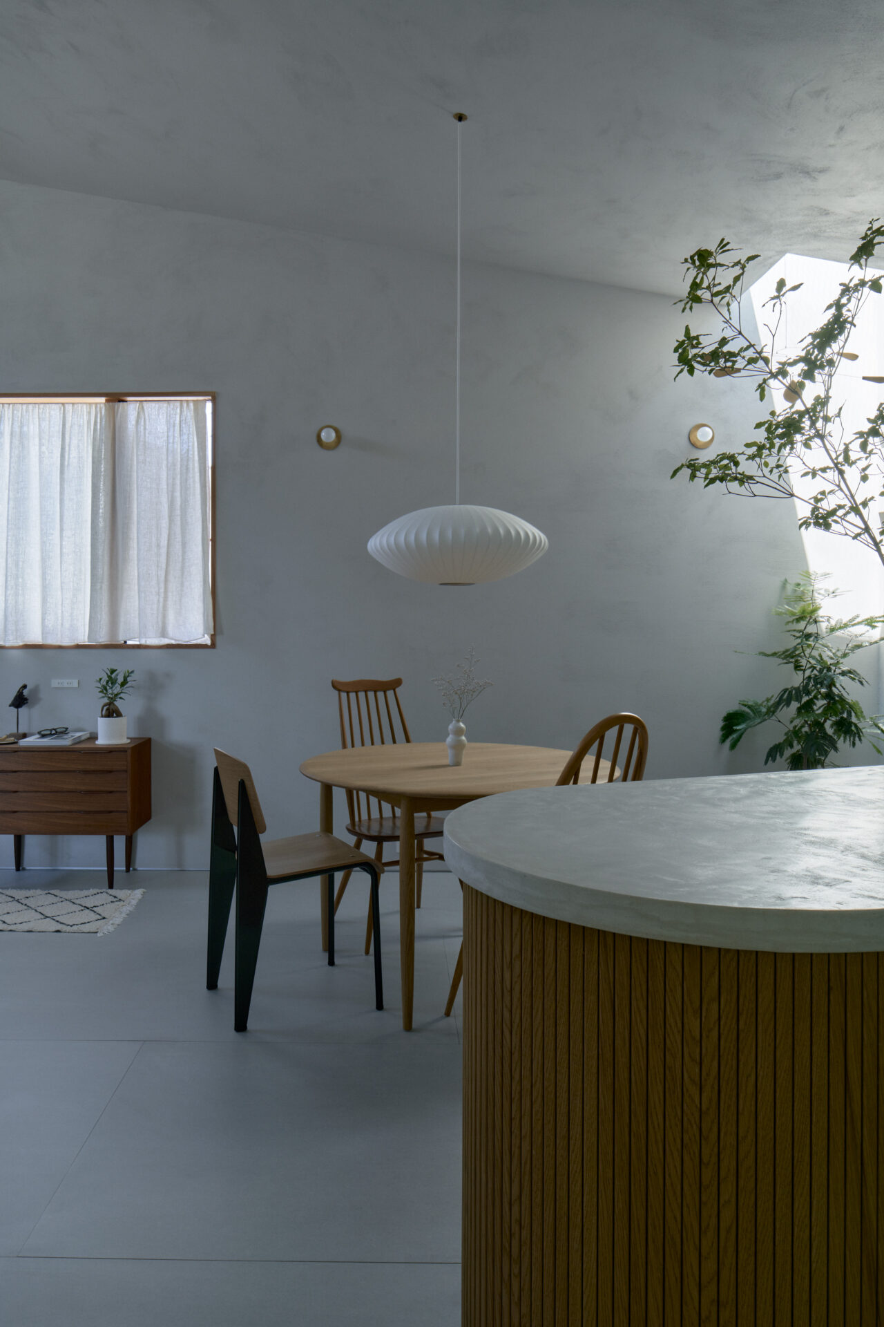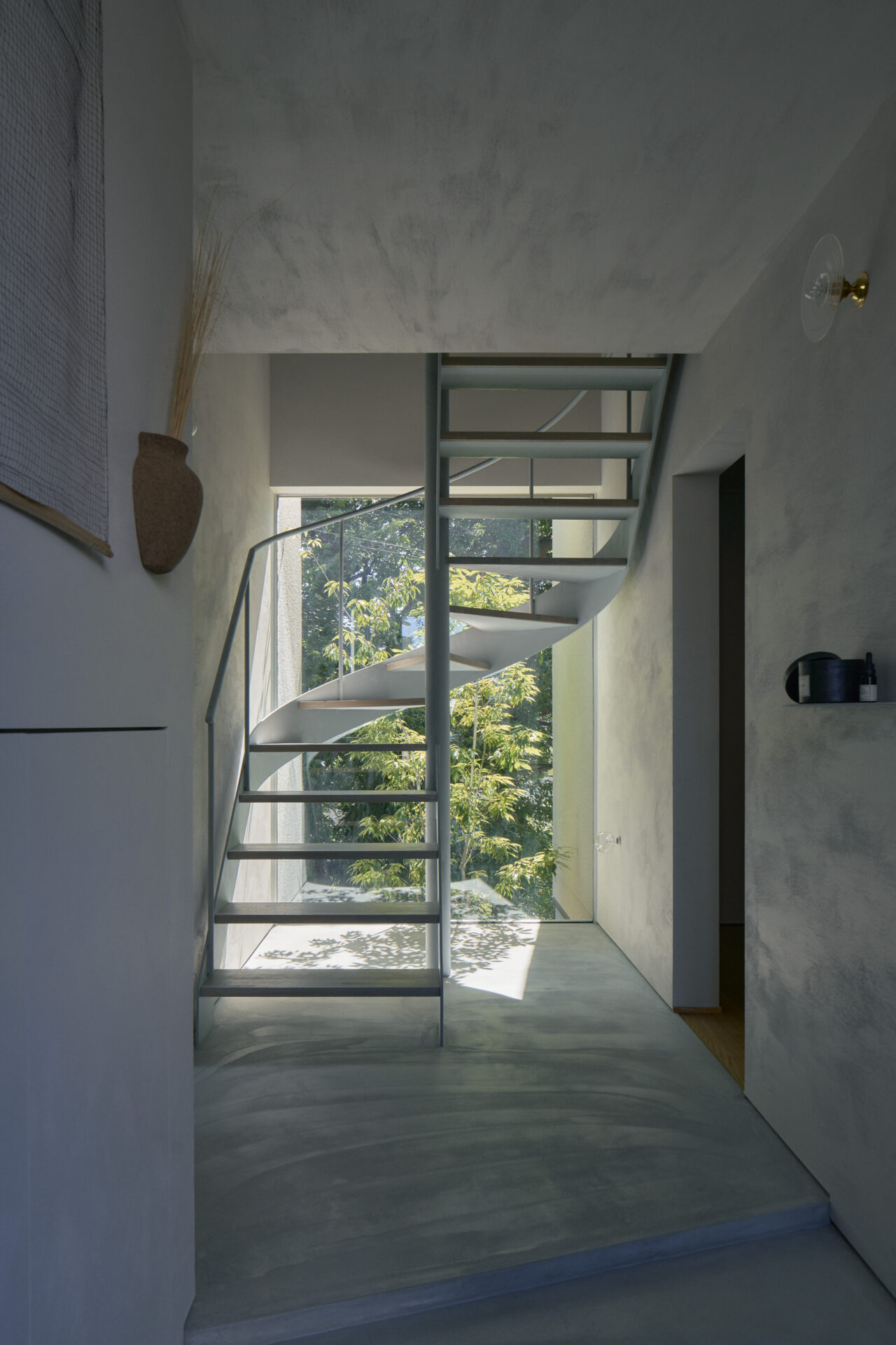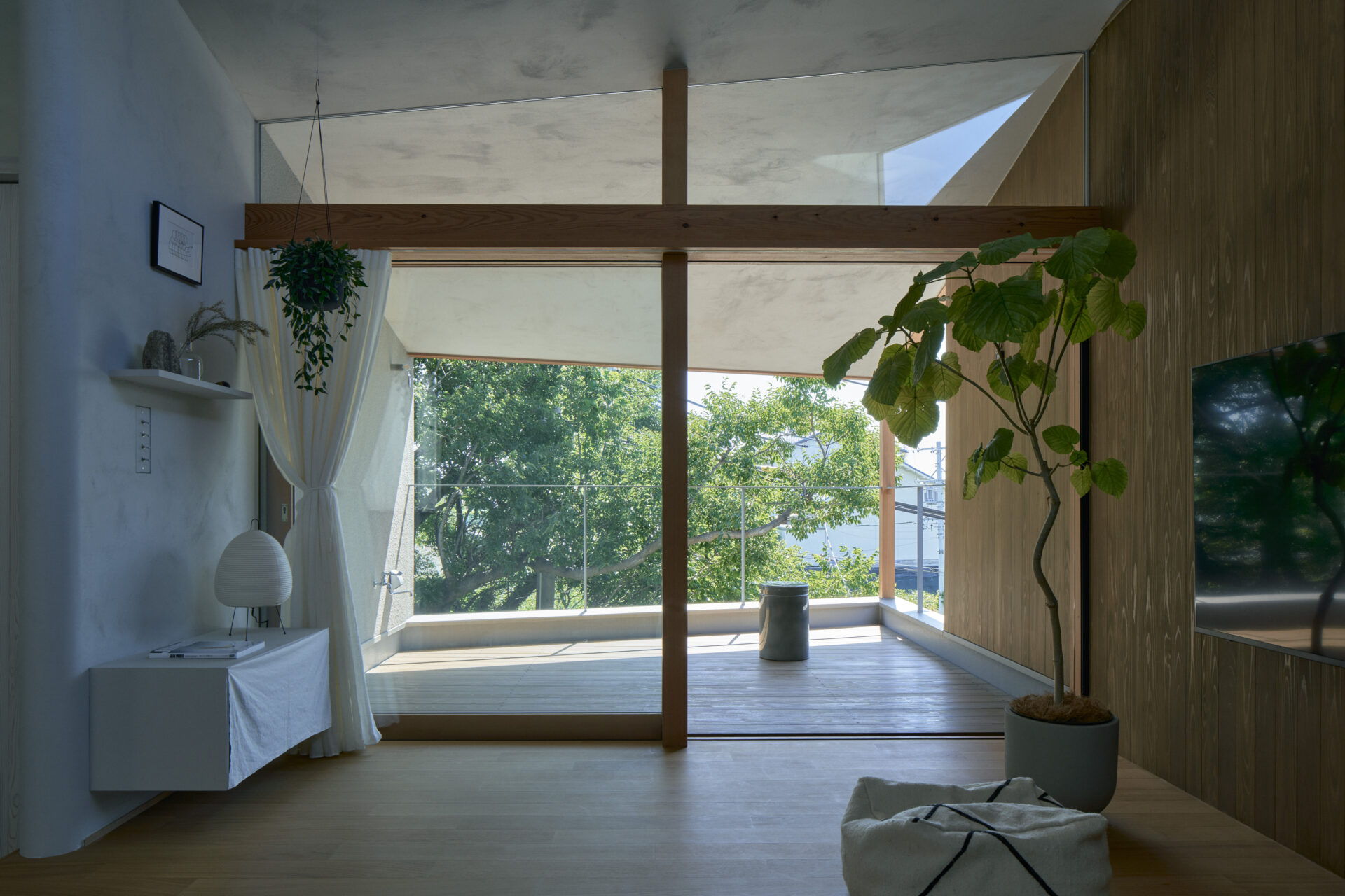 道路向かいに小川が流れ、敷地に迫る様に大木が植わる地。敷地環境的に主な生活レベルは2階とし、より川辺の緑が近くなるように。