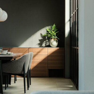 奇をてらわず調和のとれた空間をシンプルにつくるのは意外と難しいものです。家具、照明、床材、キッチンにオーディオ。多くの素材や色を包み込んでいるのはストーンペイントファイン。色はDONKEY GREYです。控えめで多弁な色は空間の調和を整える名脇役です。