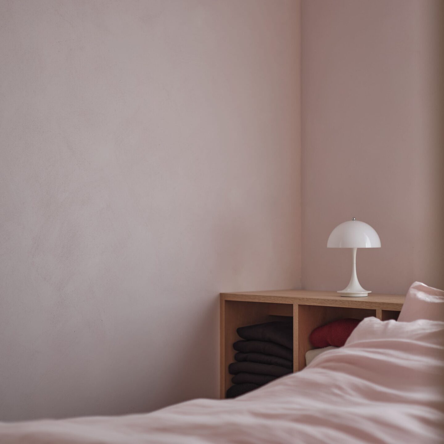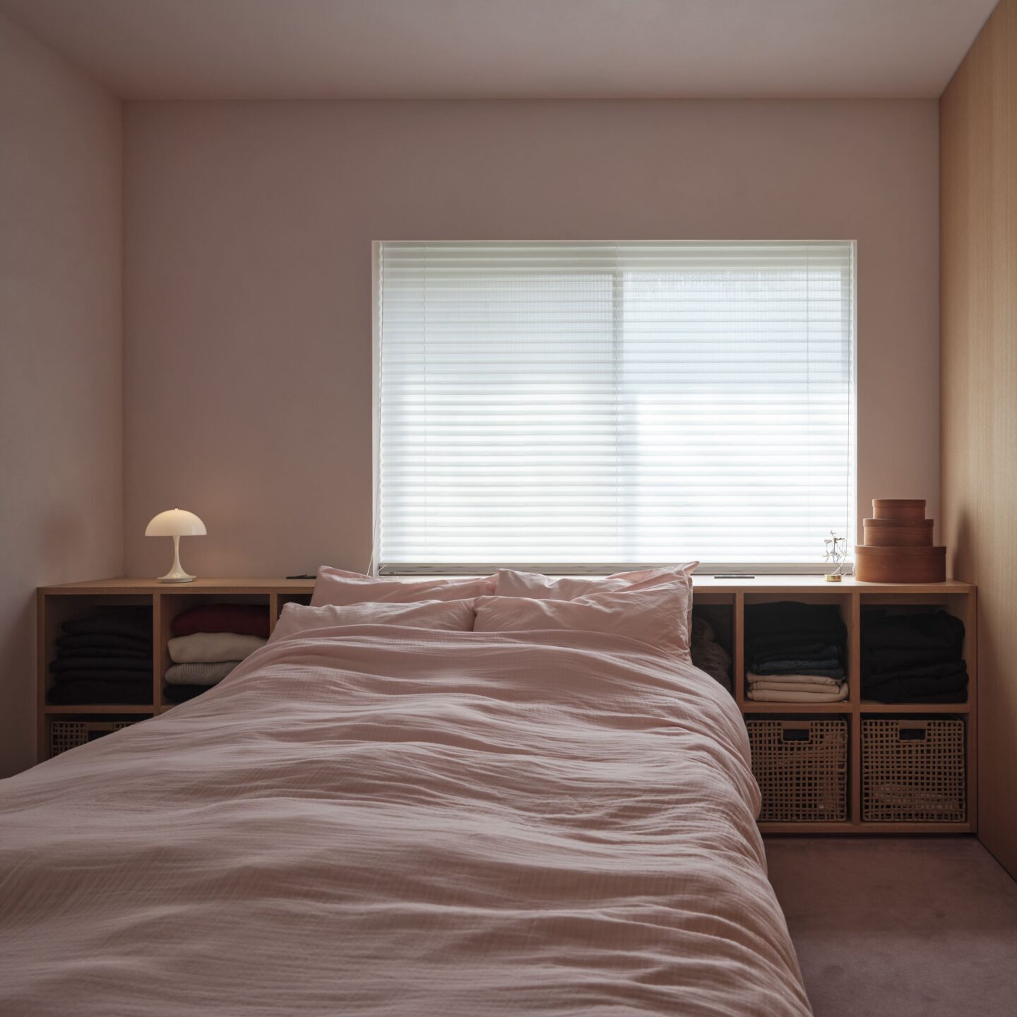 寝室はSTONE PAINT COARSE「TUTU」。バレエのチュチュを思わせる柔らかなピンクは窓の先に広がる桜並木を想起させます。