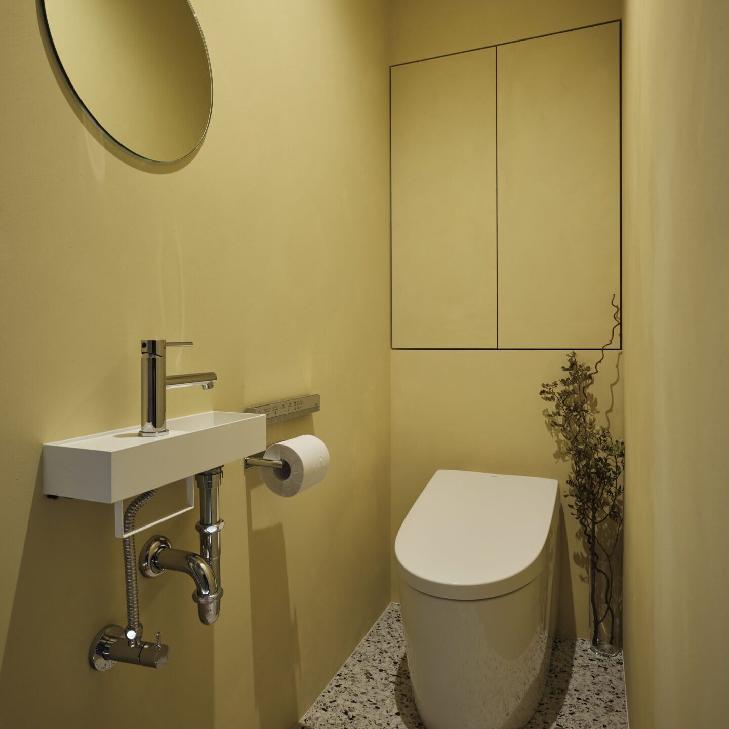 お手洗いはSTONE PAINT FINE「RATTAN」。明るい色味が気分転換やリフレッシュをやさしく促します。